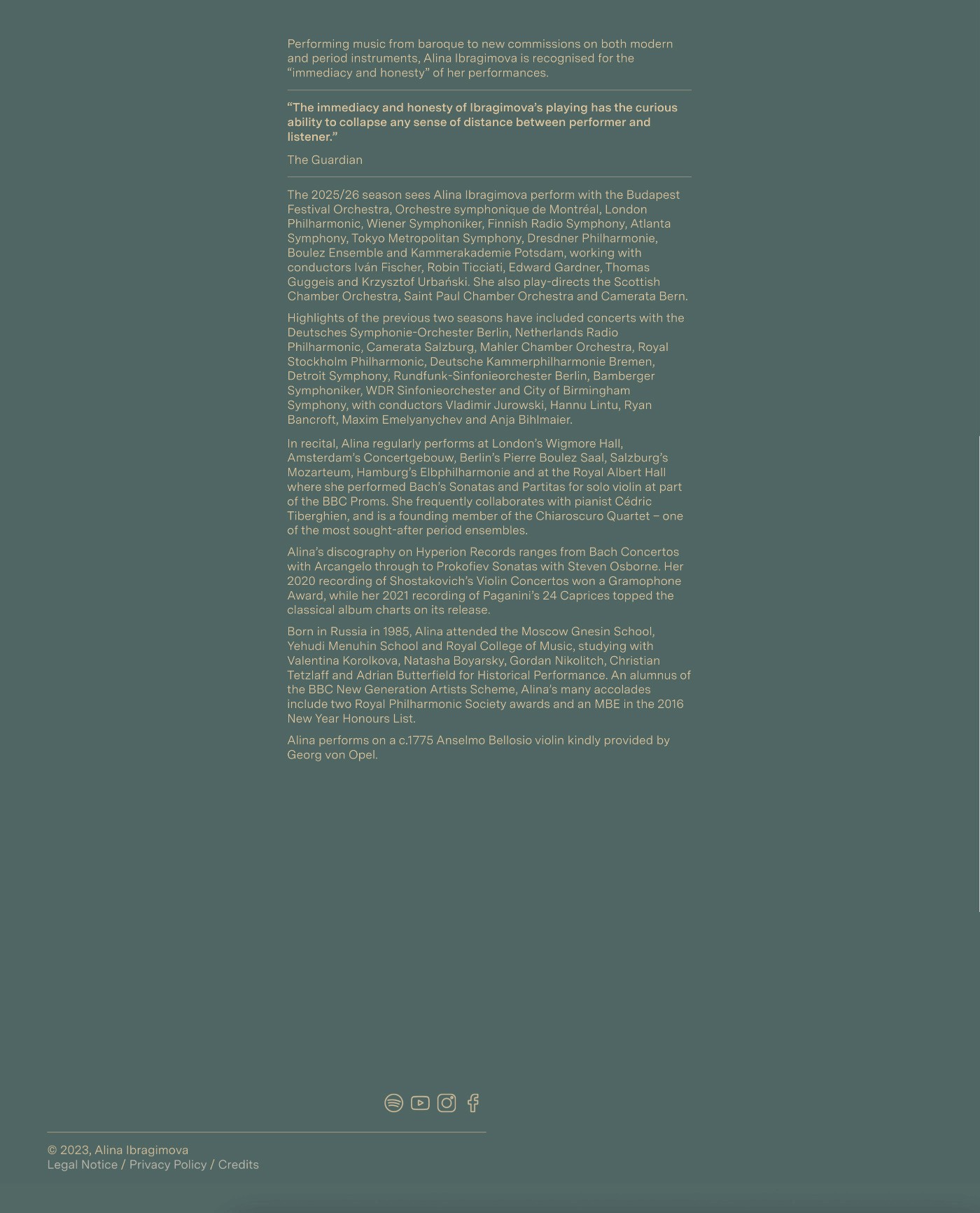 Die in Russland geborene und in England lebende Geigerin Alina Ibragimova tritt als Solistin mit den großen Orchestern der Welt auf. „Es geht ihr darum, zum Kern vorzudringen, das Wesen der Musik zu ergründen, die sie spielt“, – so beschreibt der Bayerische Rundfunk ihre Kunst.